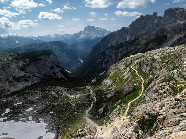 ...o poranku, wsiedliśmy do malego busa, który za jedyne 4 Euro (oplata za prywatny samochód, wynosi 20 Euro), zawiózł nas na górę, skąd wyruszyliśmy szlakiem dookoła Tre Cime - dla mnie osobiście jedne z najciekawszych i interesujących formacji skalnych, jakie do tej pory widziałam.